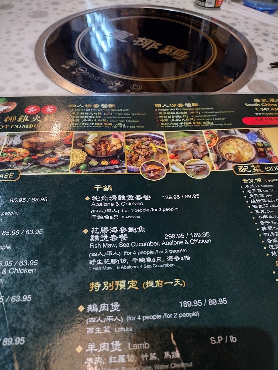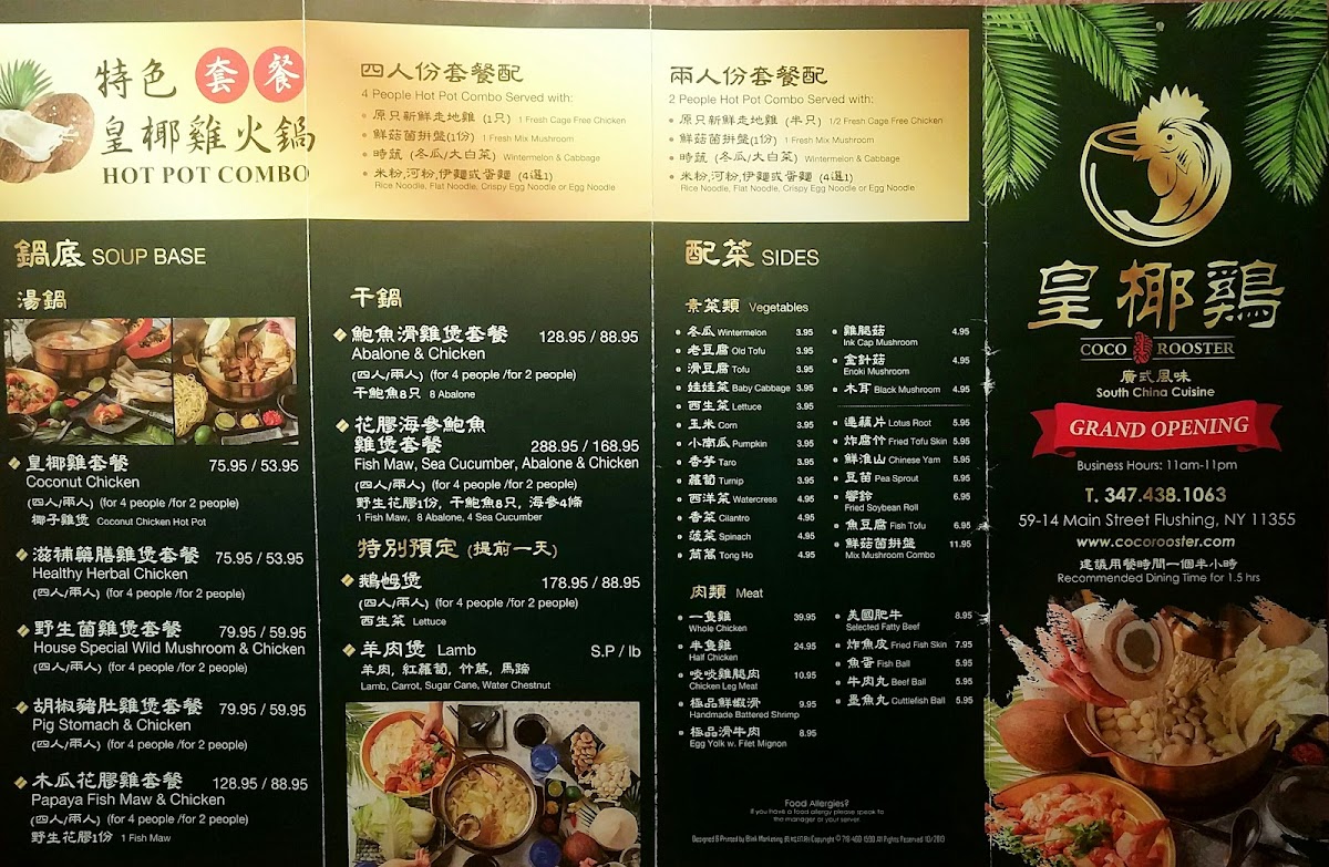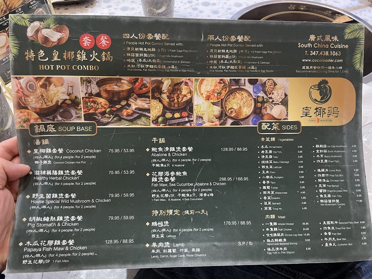 The menu at Coco Rooster 皇椰鸡 features a variety of offerings centered on hot pot dining with an emphasis on Chinese and Asian cuisine. It is organized into several main categories allowing visitors to select appetizers, drinks, and a range of sides primarily consisting of meats and seafood appropriate for hot pot preparation.