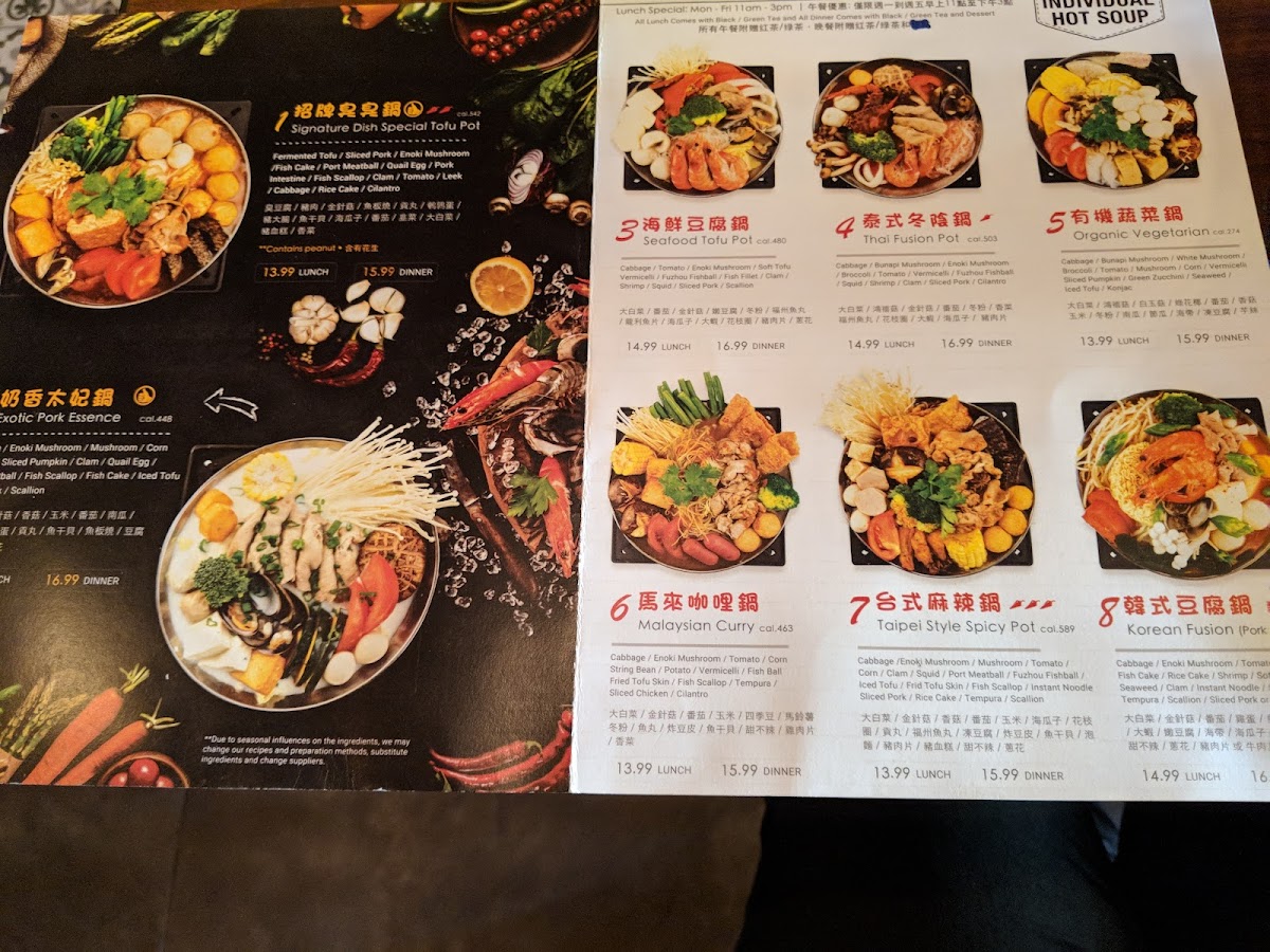 This menu structure facilitates casual dining where guests can assemble a customized hot pot experience by choosing broths, meats, seafood, and complementary appetizers, suitable for lunch, dinner, or group meals. The availability of both individual appetizers and a wide selection of hot pot ingredients supports flexible ordering options from quick light bites to full communal meals.
